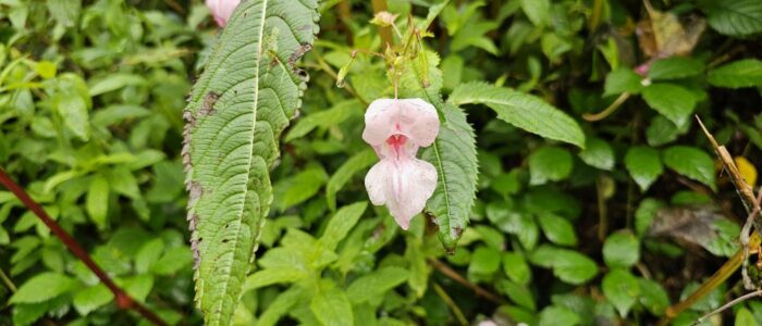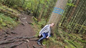 Als we verder lopen, dan is er al een beetje uitzicht, we kunnen onder het dal in kijken. De route loopt nog steeds over smalle paadjes en we moeten voorzichtig zijn met alle boomwortels die hier uitsteken.