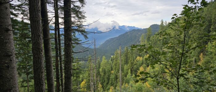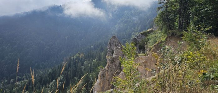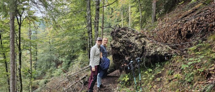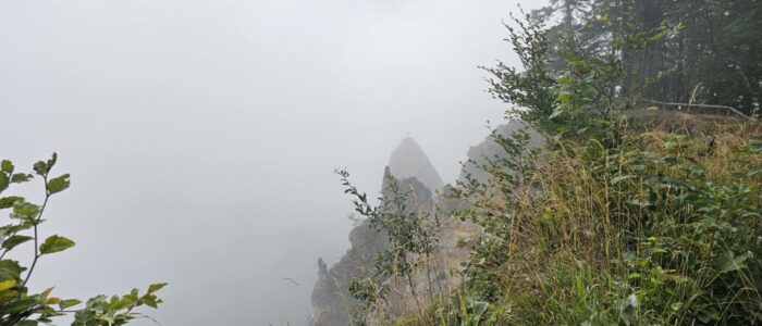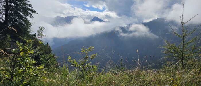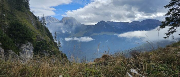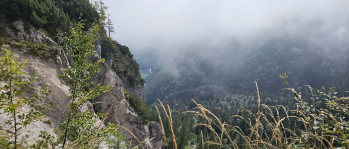 Het was bewolkt vandaag. Het begon heel bewolkt zodat we in de wolken liepen en geen uitzicht hadden. Later klaarde het enigszins op en gingen de wolken meer omhoog. Daardoor hadden we een heel mooi uitzicht vanaf de Archenkanzel. De temperatuur was prima, een beetje fris aan het begin, maar daarna prima om zonder jas te lopen. En, heel belangrijk, het was droog.