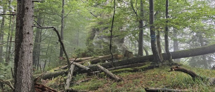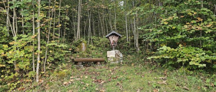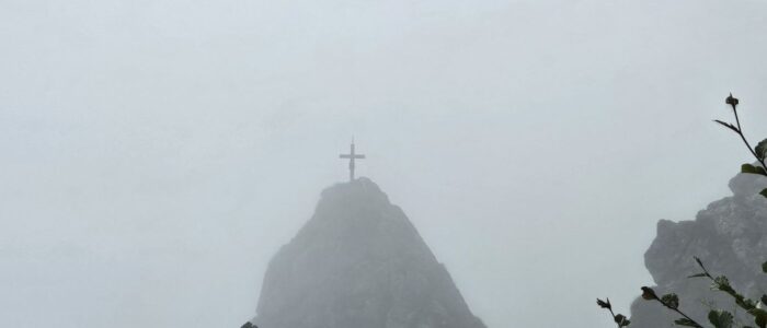 Het gaat meteen steil omhoog over smalle zig zag paadjes, het is afzien de eerste 2 kilometer. Gelukkig staan er regelmatig bankjes zodat we even op adem kunnen komen. En we krijgen een beloning in de vorm van de Grünsteinhütte en die is nog open ook. Dus tijd voor koffie, thee en Schorle. Er is helaas nog geen uitzicht, we zitten in de wolken.