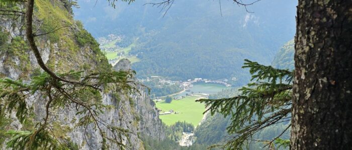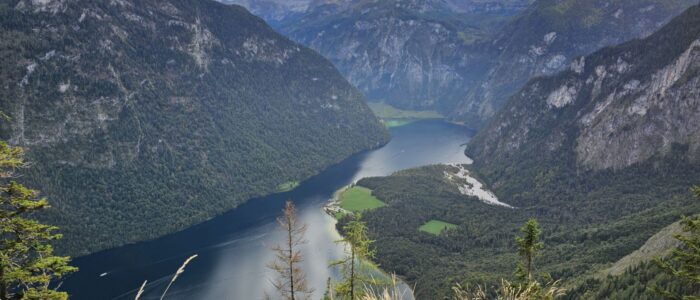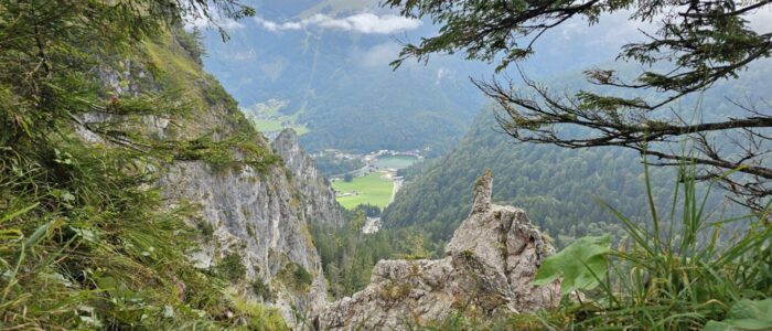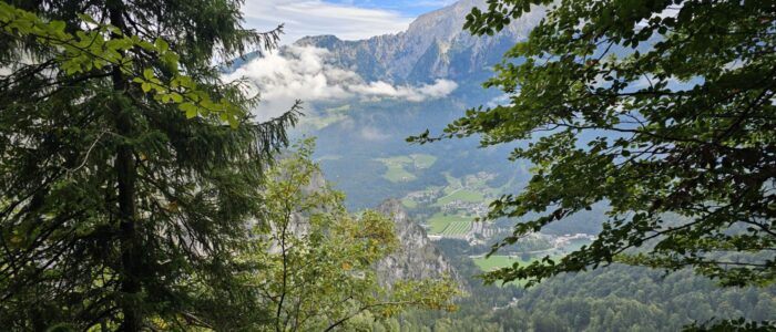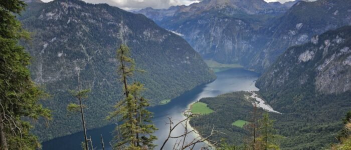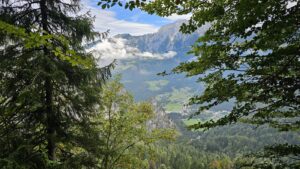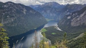 Vanaf de Kührointalm lopen we op en neer naar de Archenkanzel, dat is een stuk omlaag maar zeer de moeite waard. We hebben hier een heel mooi uitzicht over de Königssee met St. Bartholomä en we zien alle rondvaart boten op en neer gaan.