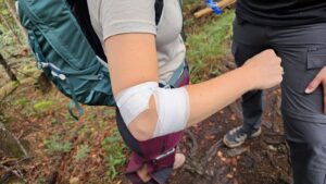 Een stukje verder krijgen we flinke schrik, Lise valt. Als ik haar zie liggen ben ik al bang voor het ergste. Gelukkig valt het mee, ze heeft alleen haar elleboog bezeerd (schaafwond) en daar heb ik wel iets voor in mijn eerste hulp kitje, heb ik dat al die jaren niet voor niets meegesleept.