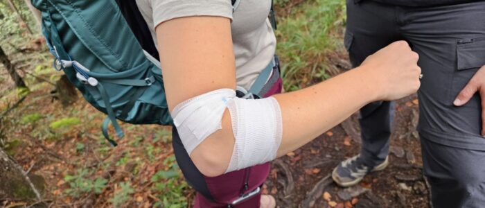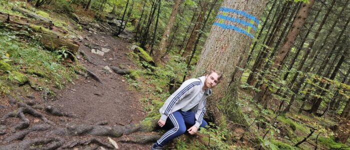 Zodra we Lise haar elleboog verbonden hebben, gaat het verder. Nu komen we bij een Adidas boom uit, dat is iets voor Gerben met zijn Adidas kleding. Daar maken we dus een mooie foto van.