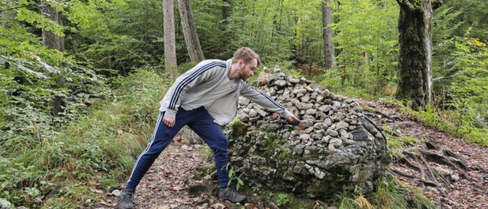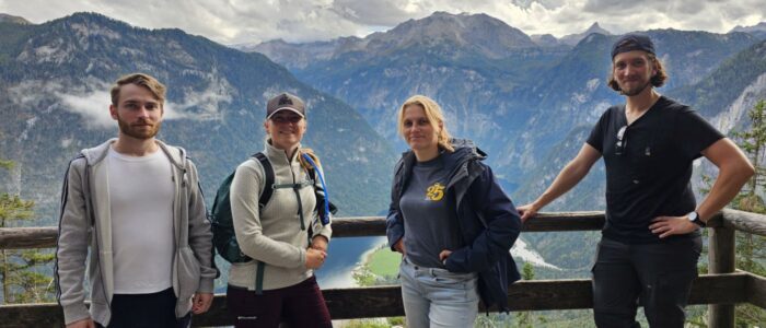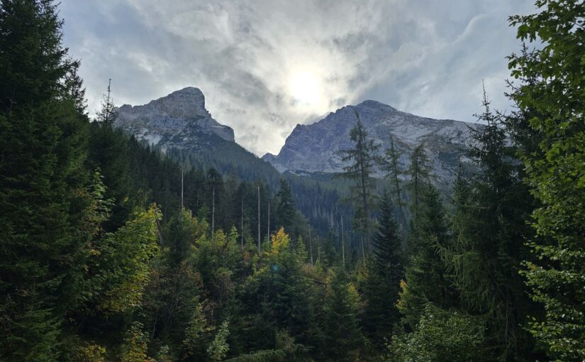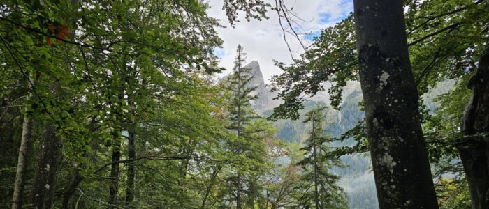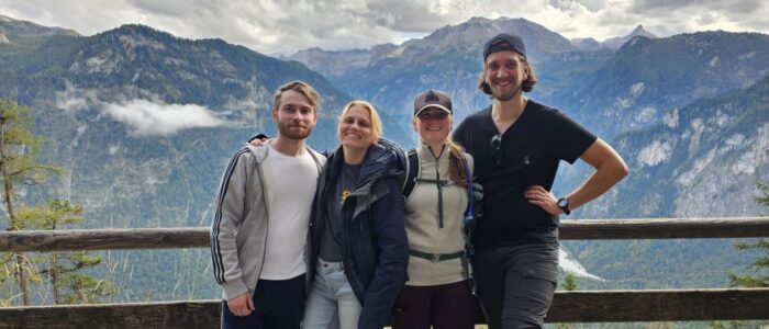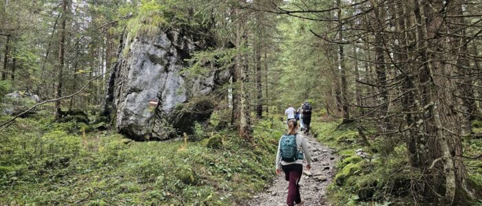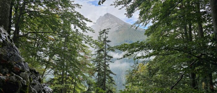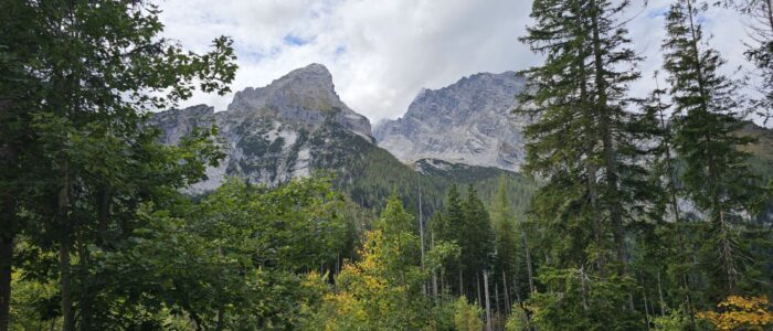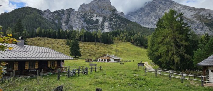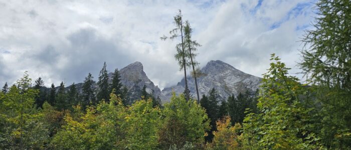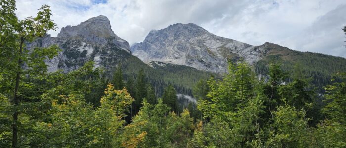 We hebben het steilste stuk wel gehad en het gaat nu geleidelijk omhoog. We hebben een mooi zicht op de Watzmann, de hoogste berg van de regio met 2713 meter. De Watzmann wordt vergezeld door de Watzmannfrau, de linker top, en de Watzmannkinder (zie de foto bovenaan dit blogartikel). Na een tijdje komen we bij de Kührointhütte. Hier nemen we weer een pauze, deze keer ook voor lunch. We zitten lekker buiten en de zon komt zelfs even door.